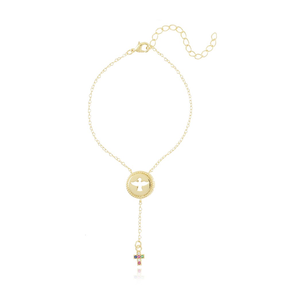 PULSEIRA POMBA DA PAZ E CRUZ CRAVEJADA CRISTAL.DIMENSÕES / PESO: - PESO: 2,5gr; MATERIAL: - LATÃO BANHADO A OURO 18K.