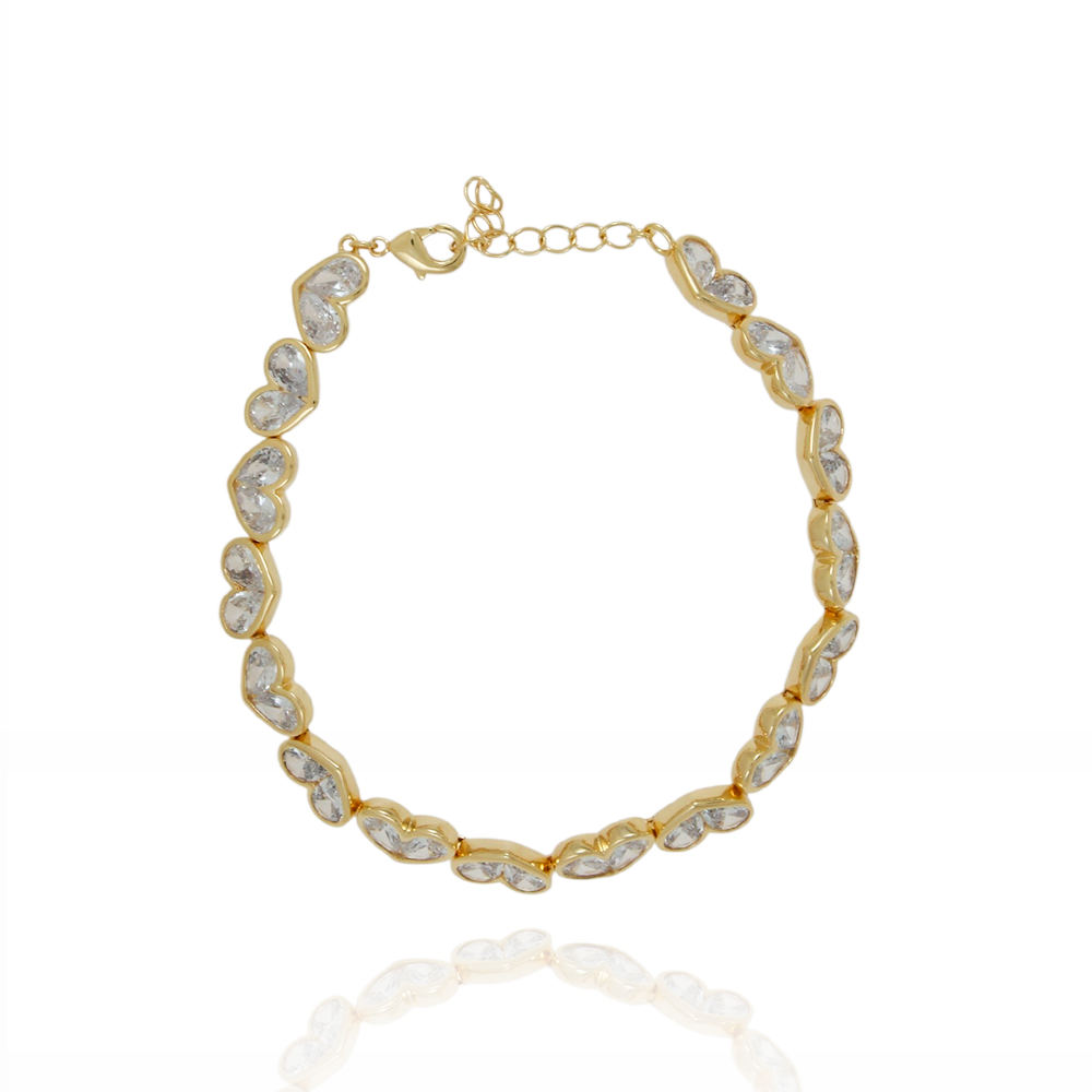 Encante-se com essa pulseira!Esta linda pulseira DE CORAÇÕES CRAVEJADOS CRISTAIS é feito com LATÃO BANHADO A OURO 18K de alta qualidade.