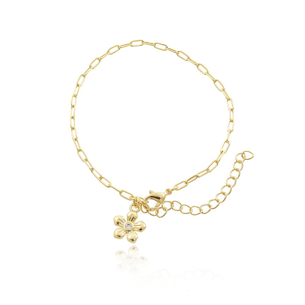 Encante-se com essa pulseira!Esta linda pulseira COM PINGENTE DE FLOR é feita com LATÃO BANHADO A OURO 18K de alta qualidade.