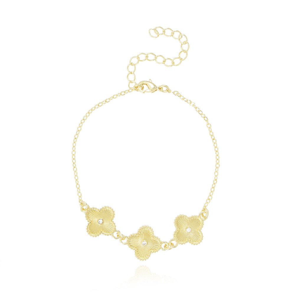 Encante-se com essa pulseira!Esta linda pulseira TREVO CRAVEJADA DE ZIRCÔNIA é feito com LATÃO BANHADO A OURO 18K de alta qualidade.