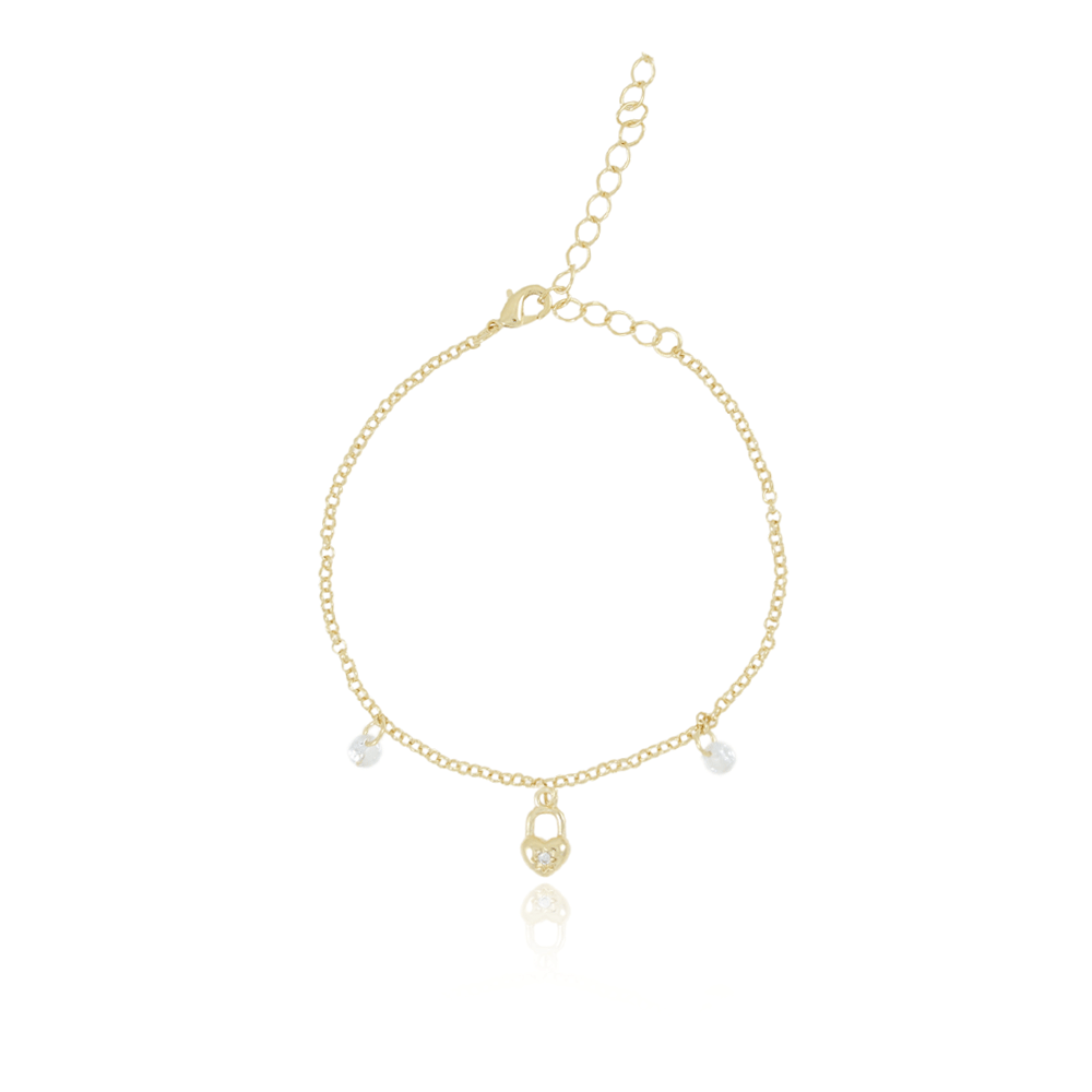 Encante-se com essa pulseira!Esta linda pulseira COM ZIRCÔNIAS CRISTAIS E CADEADO DE CORAÇÃO é feita com LATÃO BANHADO A OURO 18K de alta qualidade.