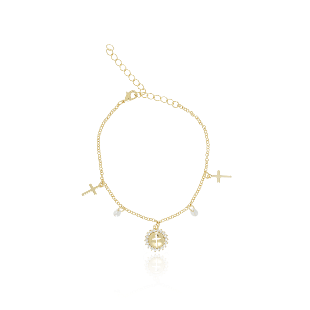Encante-se com essa pulseira!Esta linda pulseira COM PINGENTES DE CRUZ, ZIRCÔNIAS CRISTAIS E MEDALHA CRAVEJADA COM CRUZ é feita com LATÃO BANHADO A OURO 18K de alta qualidade.