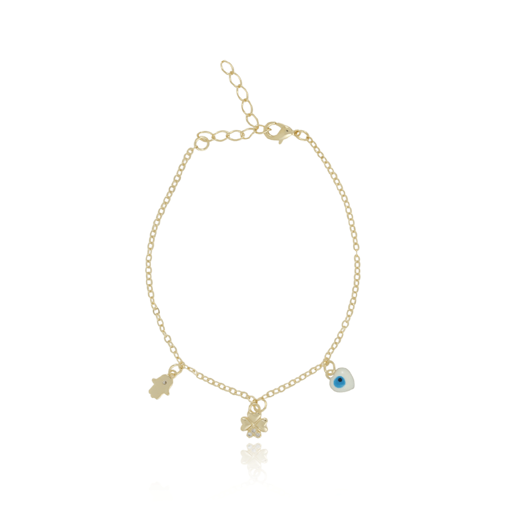 Encante-se com essa pulseira!Esta linda pulseira PROTEÇÃO COM TREVO, MÃO DE FÁTIMA E OLHO GREGO é feita com LATÃO BANHADO A OURO 18K de alta qualidade.