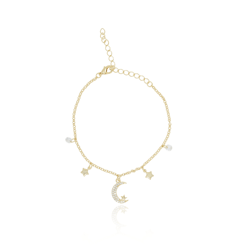 Encante-se com essa pulseira!Esta linda pulseira COM ZIRCÔNIAS CRISTAIS, ESTRELAS E LUA CRAVEJADA CRISTAL é feita com LATÃO BANHADO A OURO 18K de alta qualidade.