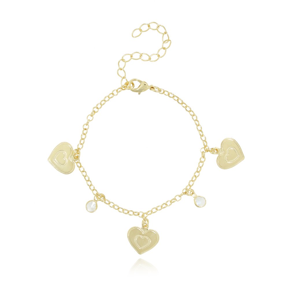 Encante-se com essa pulseira!Esta linda pulseira COM PINGENTES DE CORAÇÕES E ZIRCÔNIAS CRISTAIS é feita com LATÃO BANHADO A OURO 18K de alta qualidade.