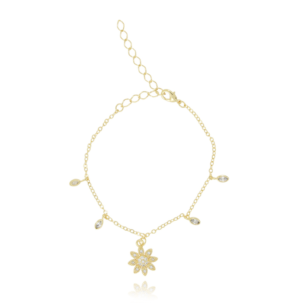 Encante-se com essa pulseira!Esta linda pulseira DE FLOR E ZIRCÔNIAS CRISTAIS é feita com LATÃO BANHADO A OURO 18K de alta qualidade.