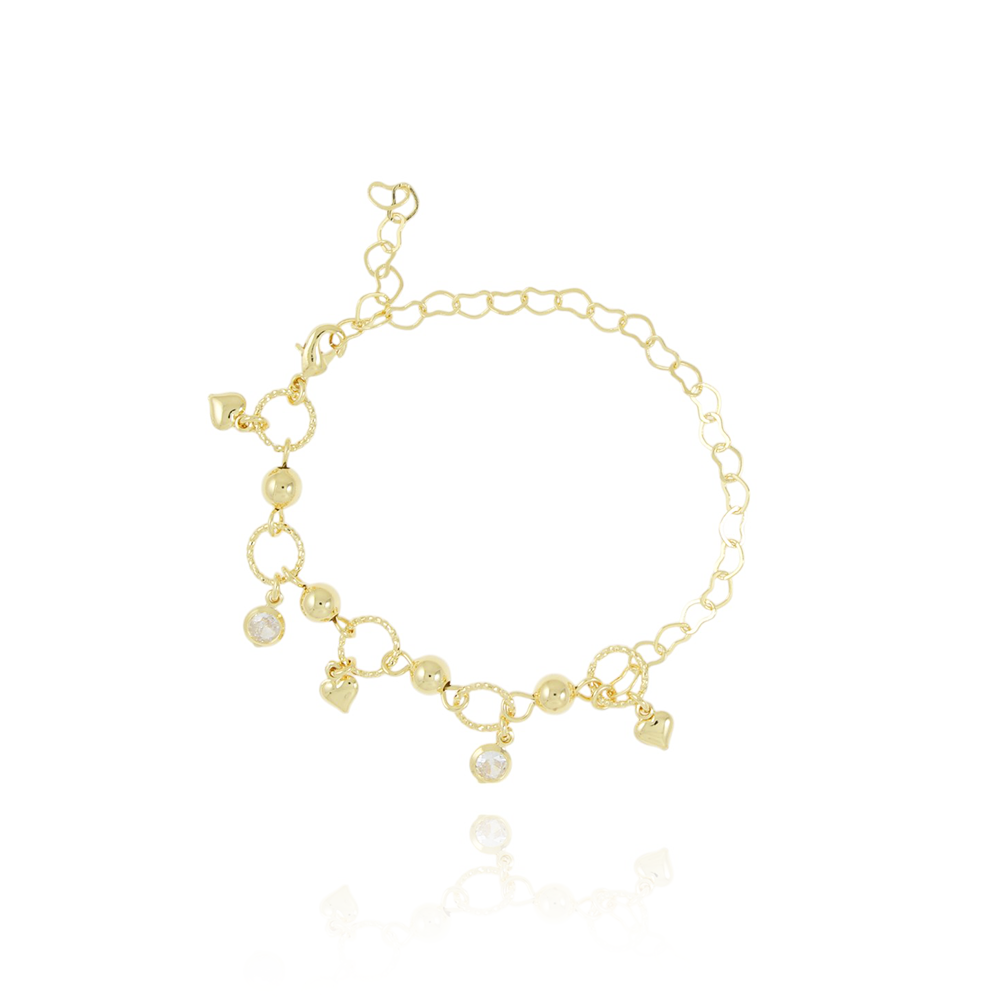 Encante-se com essa pulseira!Esta linda pulseira METADE ELINHO DE CORAÇÕES E METADE DETALHADA COM ZIRCÔNIAS CRISTAIS E CORAÇÕES é feita com LATÃO BANHADO A OURO 18K de alta qualidade.