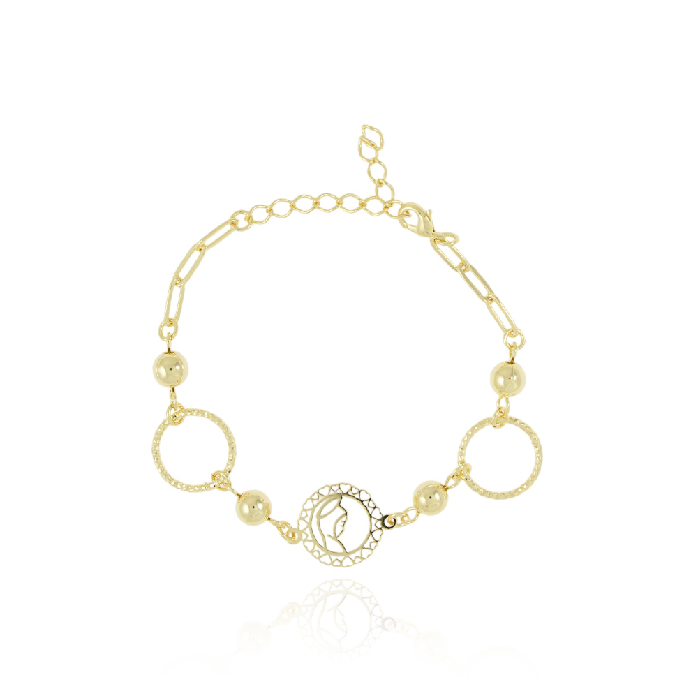 Encante-se com essa pulseira!Esta linda pulseira NOSSA SENHORA COM DETALHES VAZADOS E BOLINHAS é feita com LATÃO BANHADO A OURO 18K de alta qualidade.