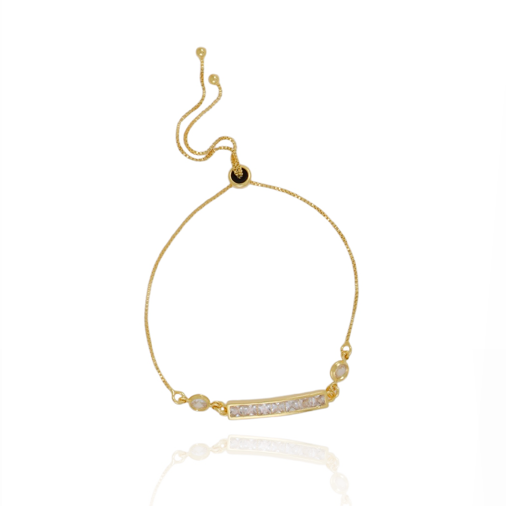 Encante-se com essa pulseira!Esta linda pulseira REGULÁVEL CRAVEJADA DE ZIRCÔNIAS CRISTAIS é feita com LATÃO BANHADO A OURO 18K de alta qualidade.