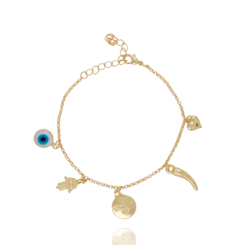 Encante-se com essa pulseira!Esta linda pulseira PROTEÇÃO é feita com LATÃO BANHADO A OURO 18K de alta qualidade.