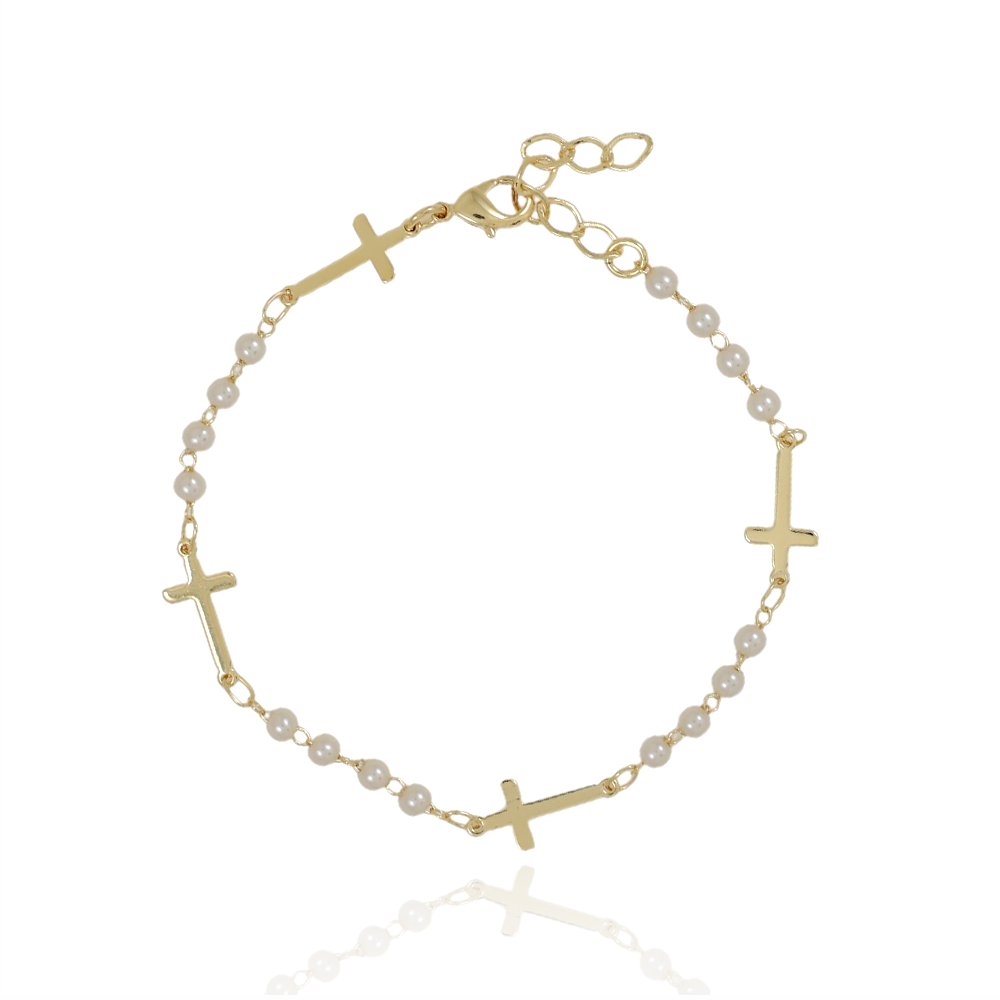 Encante-se com essa pulseira!Esta linda pulseira DE PÉROLA COM CRUZ é feita com LATÃO BANHADO A OURO 18K de alta qualidade.