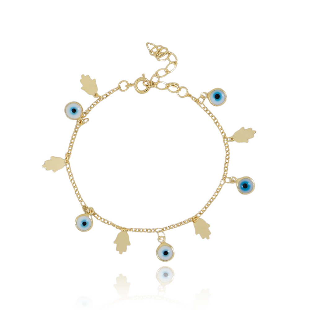 Encante-se com essa pulseira!Esta linda pulseira MÃO DE FÁTIMA E OLHO GREGO é feita com LATÃO BANHADO A OURO 18K de alta qualidade.