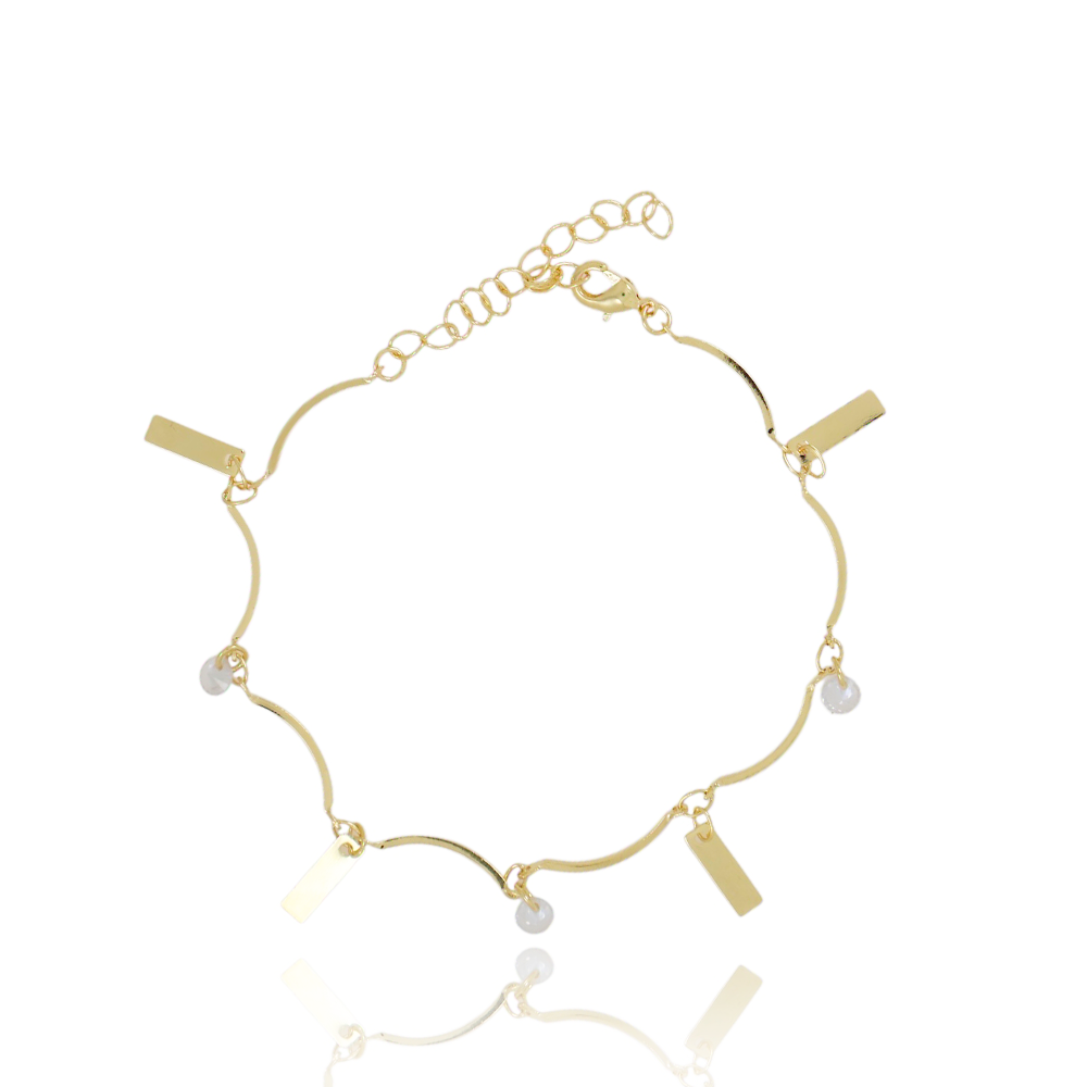Encante-se com essa pulseira!Esta linda pulseira PALITO COM PINGNTES DE ZIRCÔNIAS CRISTAIS E PLAQUINHAS LISAS é feita com LATÃO BANHADO A OURO 18K de alta qualidade.