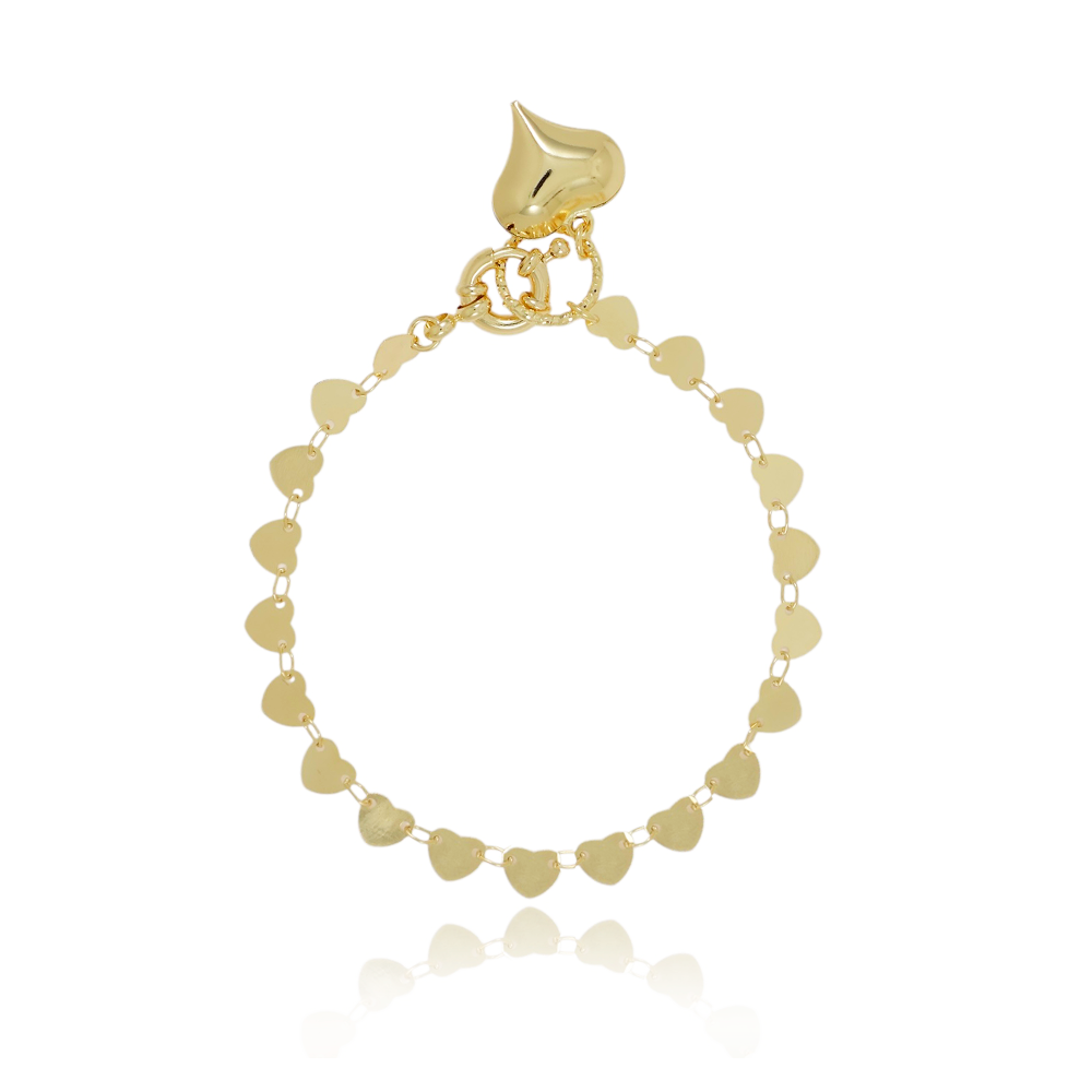 Encante-se com essa pulseira!Esta linda pulseira DE CORAÇÕES COM FECHO BOIA é feita com LATÃO BANHADO A OURO 18K de alta qualidade.