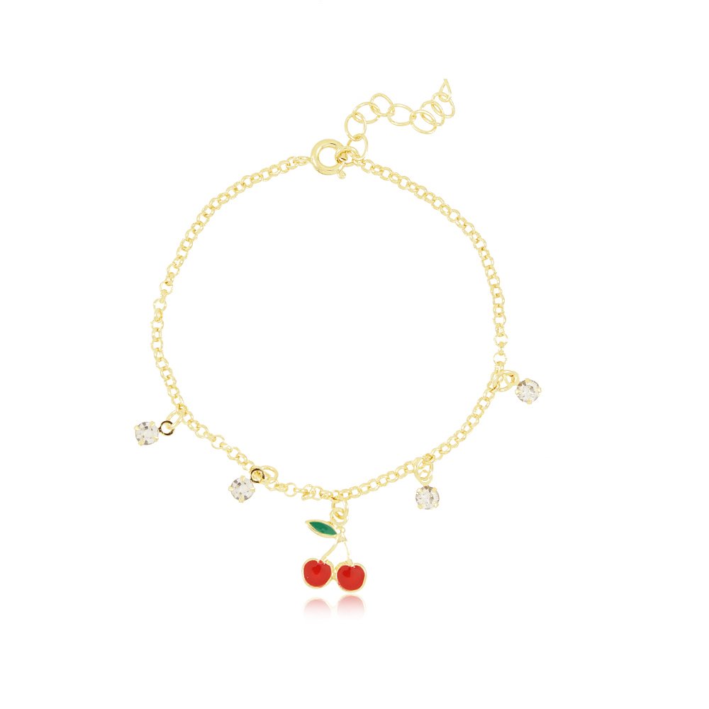 Encante-se com essa pulseira!Esta linda pulseira INFANTIL DE CEREJACOM RESINA E ZIRCÔNIAS é feita com LATÃO BANHADO A OURO 18K de alta qualidade.