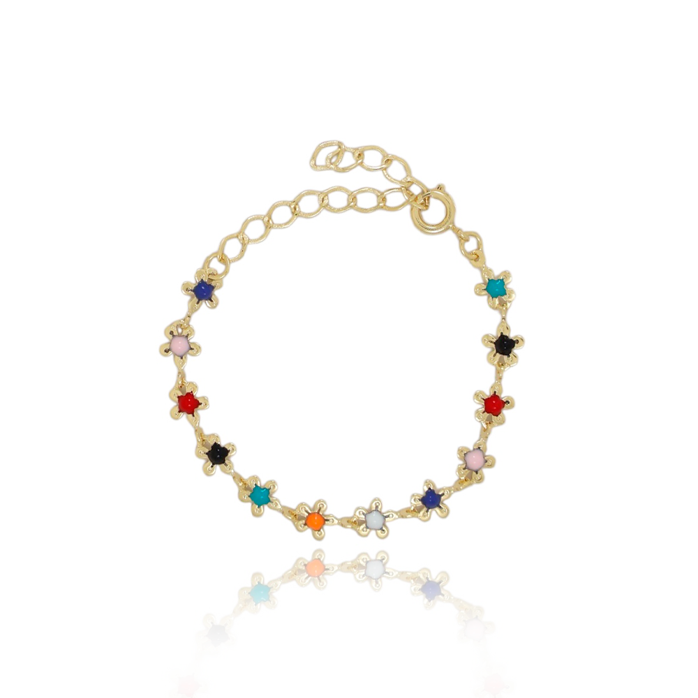 Encante-se com essa pulseira!Esta linda pulseira DE FLORZINHAS COLORIDAS INFANTIL é feita com LATÃO BANHADO A OURO 18K de alta qualidade.
