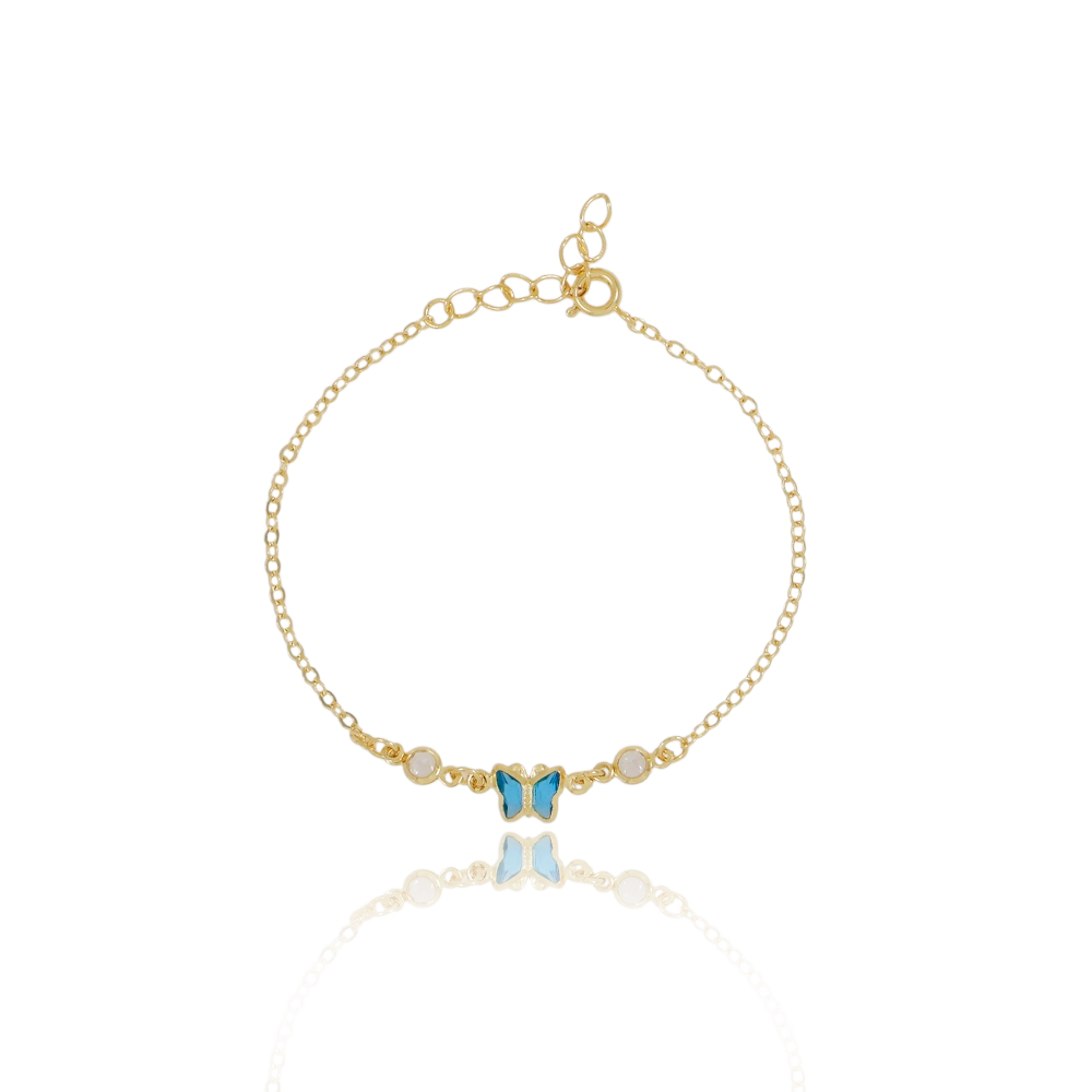 Encante-se com essa pulseira!Esta linda pulseira INFANTIL BORBOLETA AZUL é feita com LATÃO BANHADO A OURO 18K de alta qualidade.