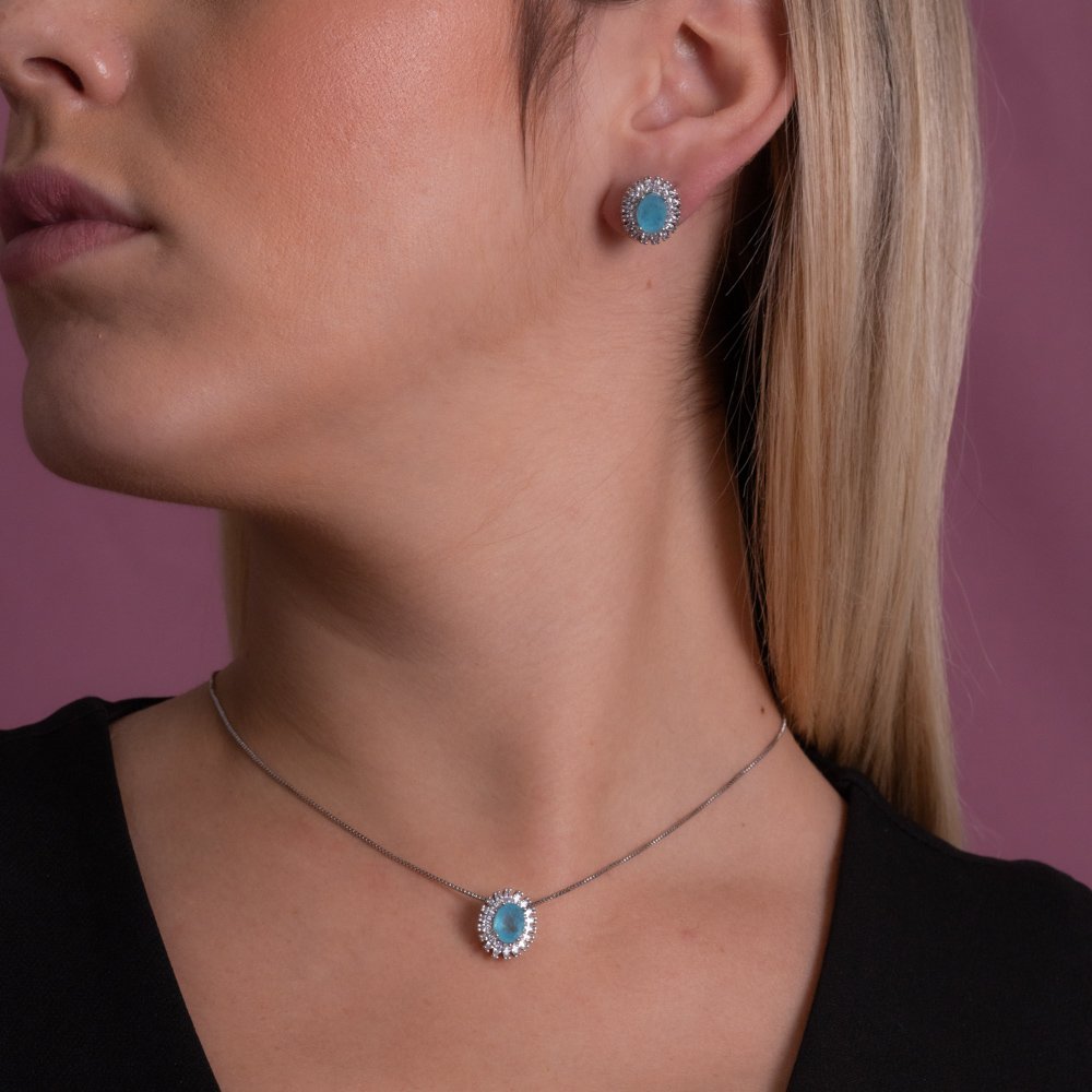 Encante-se com esse conjunto!Este lindo conjunto CRAVEJADO PEDRA AZUL FUSION é feito com LATÃO BANHADO A RÓDIO BRANCO de alta qualidade.
