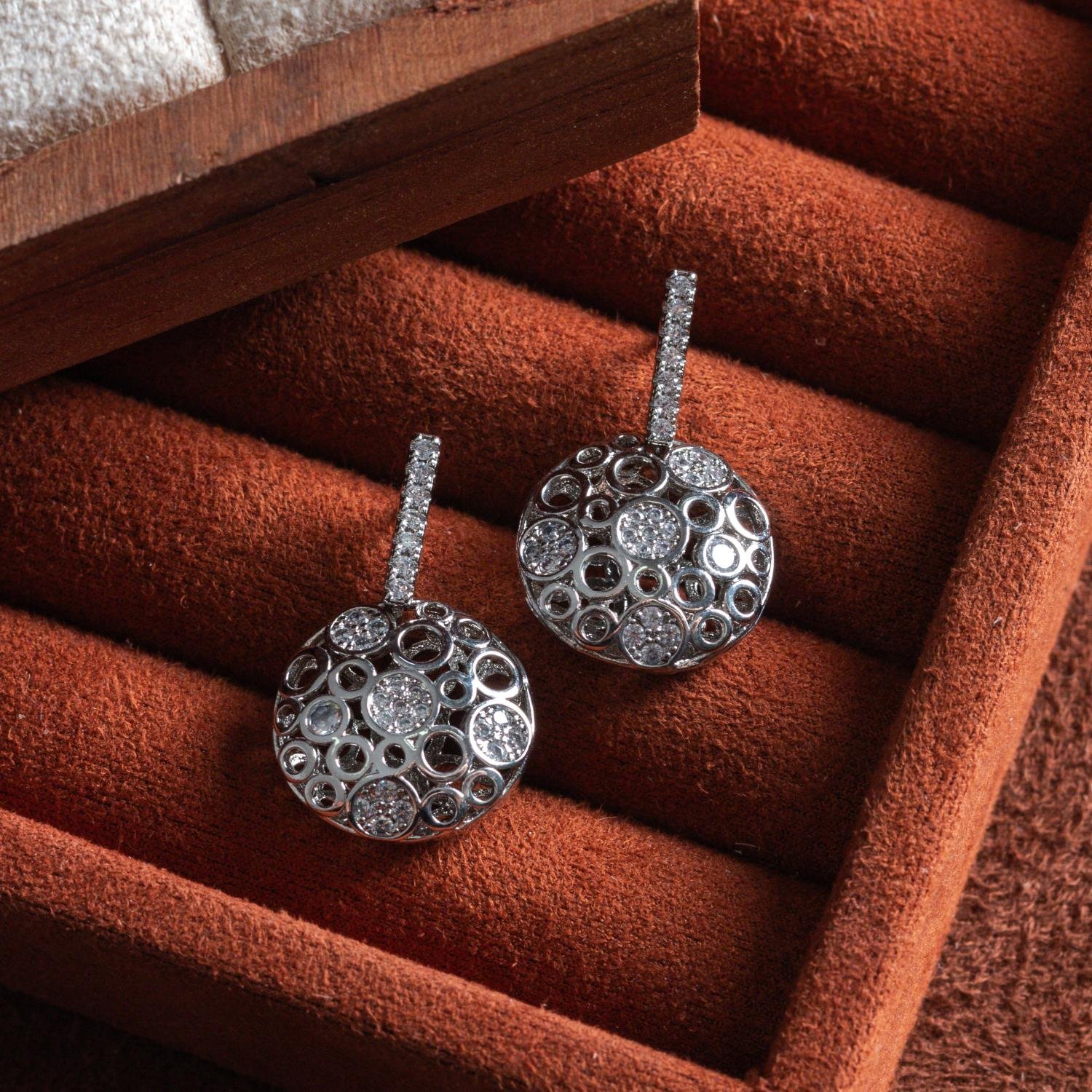 Encante-se com esse brinco!Este lindo brinco DETALHADO CRAVEJADO DE ZIRCÔNIAS CRISTAIS é feito com LATÃO BANHADO A RÓDIO BRANCO de alta qualidade.