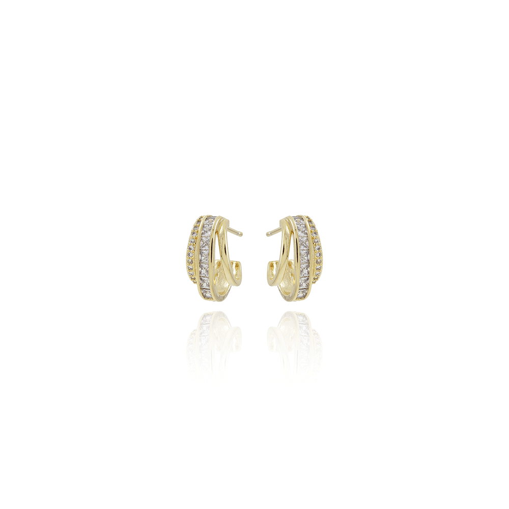 Encante-se com esse brinco!Este lindo brinco MEIA ARGOLA TRÊS FIOS CRAVEJADA CRISTAL E LISA é feito com LATÃO BANHADO A OURO 18K de alta qualidade.
