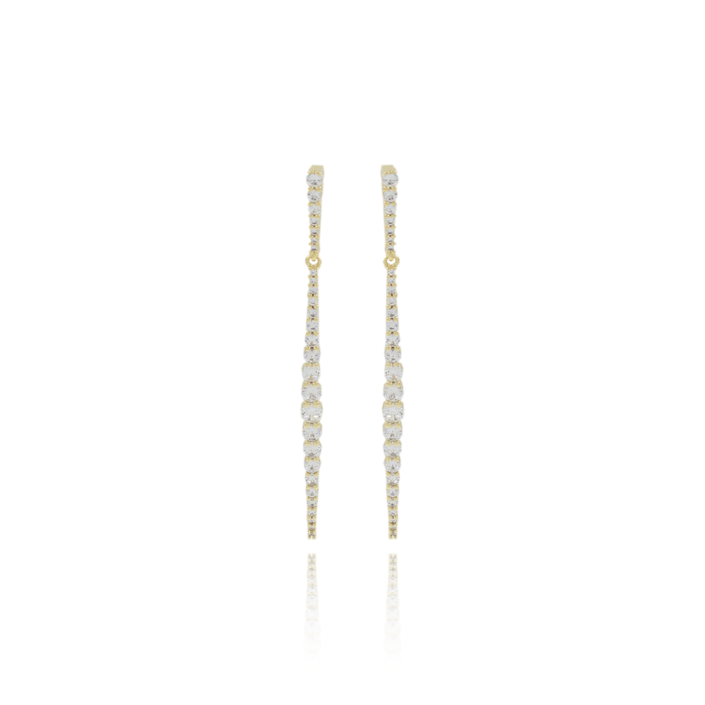 Encante-se com esse brinco!Este lindo brinco LONGO CRAVEJADO DE ZIRCÔNIAS CRISTAIS é feito com LATÃO BANHADO A OURO 18K de alta qualidade.