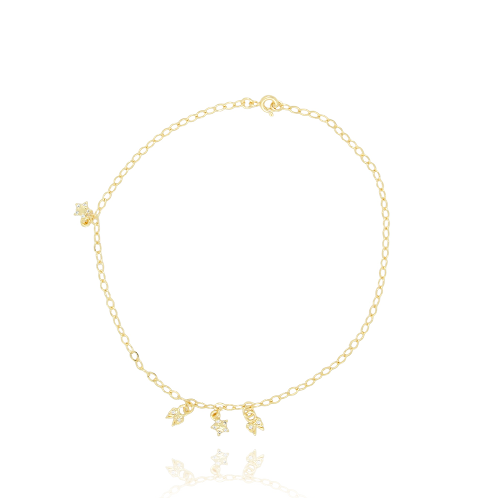 Encante-se com essa tornozeleira!Esta linda tornozeleira DE ELOS COM PINGENTES DE LAÇOS E ESTRELA CRISTAL é feita com LATÃO BANHADO A OURO 18K de alta qualidade.
