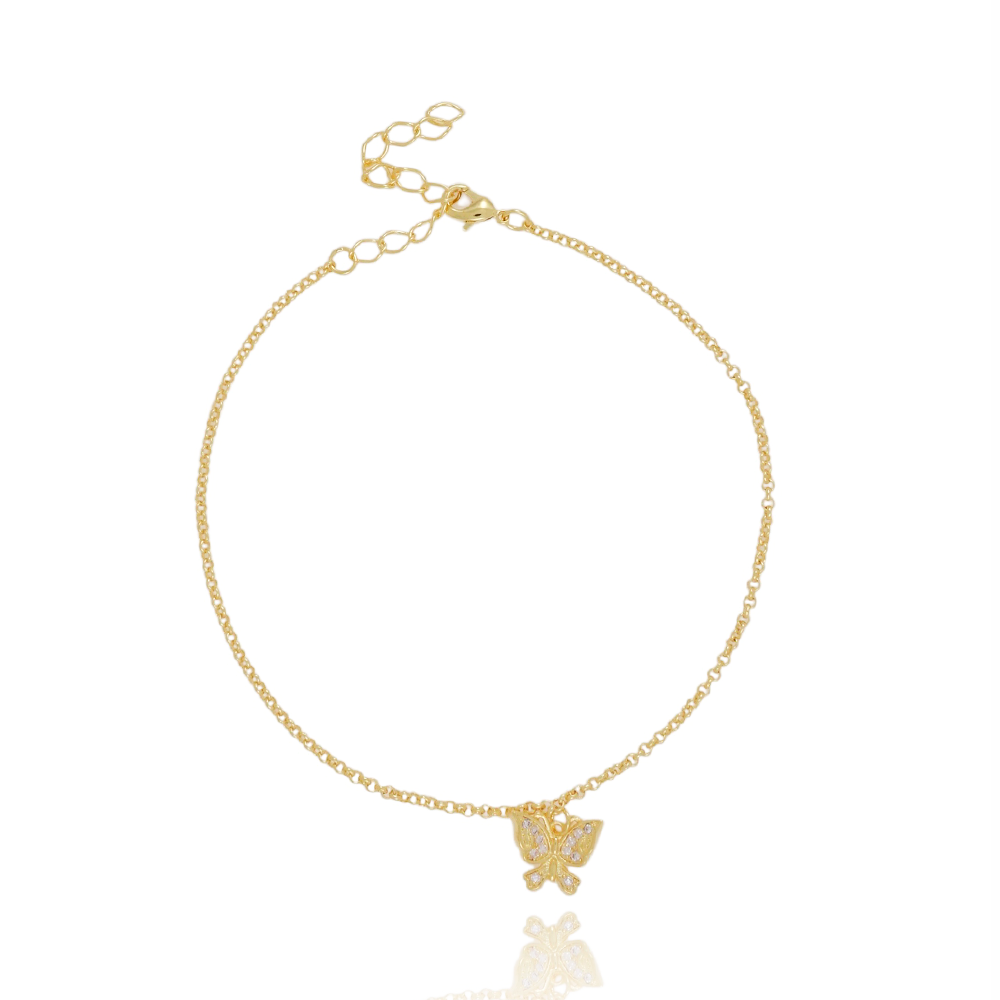 Encante-se com essa tornozeleira!Esta linda tornozeleira DE BORBOLETA CRISTAL é feita com LATÃO BANHADO A OURO 18K de alta qualidade.