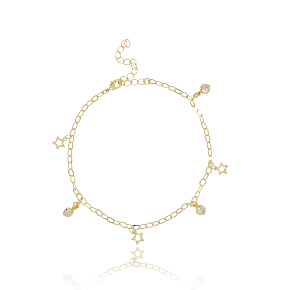 Encante-se com essa tornozeleira!Esta linda tornozeleira DE ELOS COM PINGENTE DE ESTRELAS E ZIRCÔNIAS CRISTAIS é feita com LATÃO BANHADO A OURO 18K de alta qualidade.