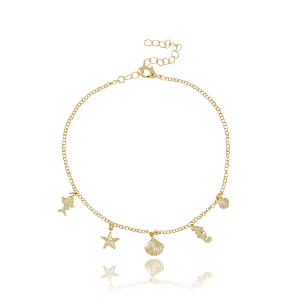 Encante-se com essa tornozeleira!Esta linda tornozeleira COM PINGENTES DE ZIRCÔNIA CRISTAL, CONCHA, CAVALO MARINHO, ESTRELA DO MAE E PEIXE é feita com LATÃO BANHADO A OURO 18K de alta qualidade.