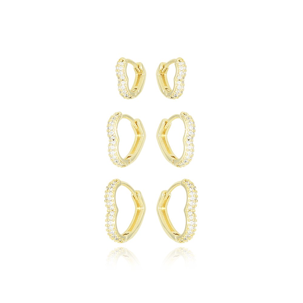 Encante-se com esse brinco!Este lindo brinco TRIO DE ARGOLAS ARTICULADAS DE CORAÇÕES CRAVEJADOS CRISTAL é feito com LATÃO BANHADO A OURO 18K de alta qualidade.