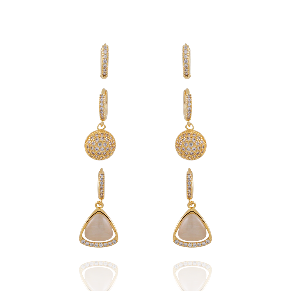 Encante-se com esse brinco!Este lindo brinco TRIO DE ARGOLAS ARTICULADAS COM PINGENTES CRAVEJADOS CRISTAL é feito com LATÃO BANHADO A OURO 18K de alta qualidade.