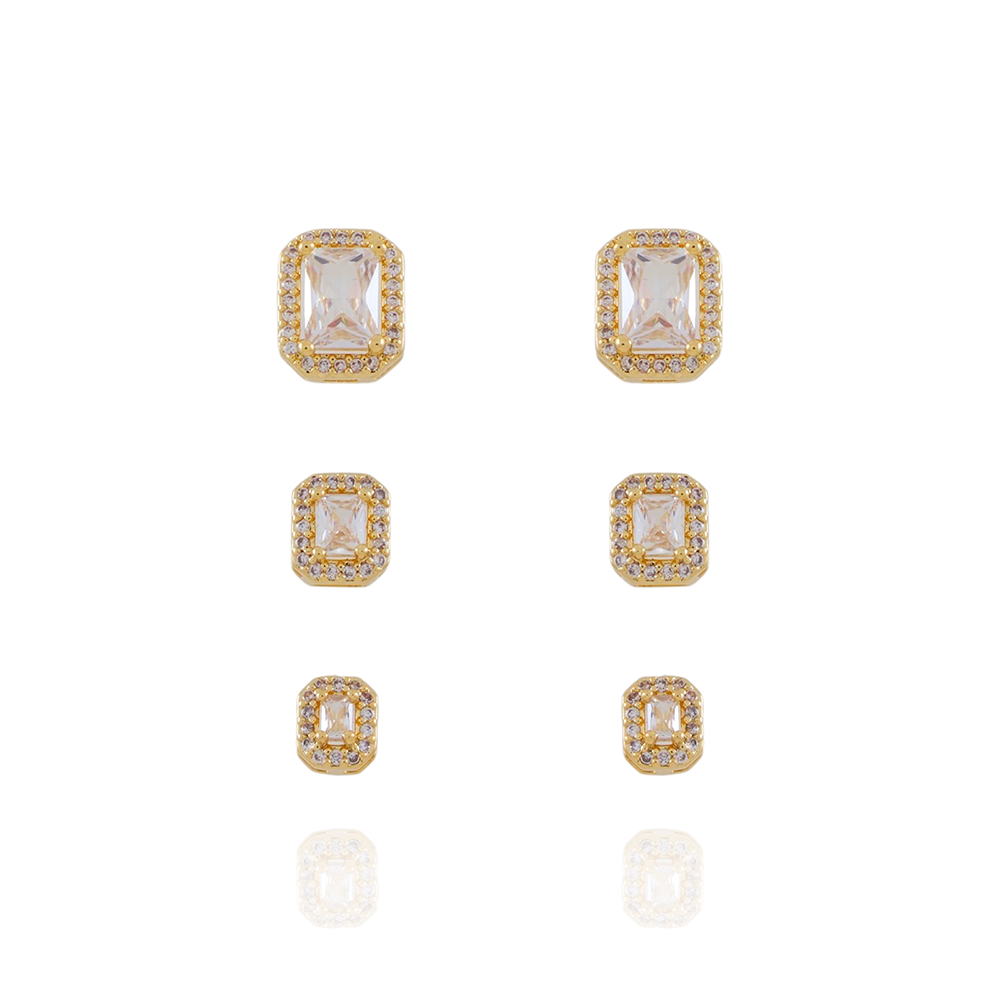 Encante-se com esse brinco!Este lindo brinco TRIO CRAVEJADO DE ZIRCÔNIAS CRISTAIS é feito com LATÃO BANHADO A OURO 18K de alta qualidade.