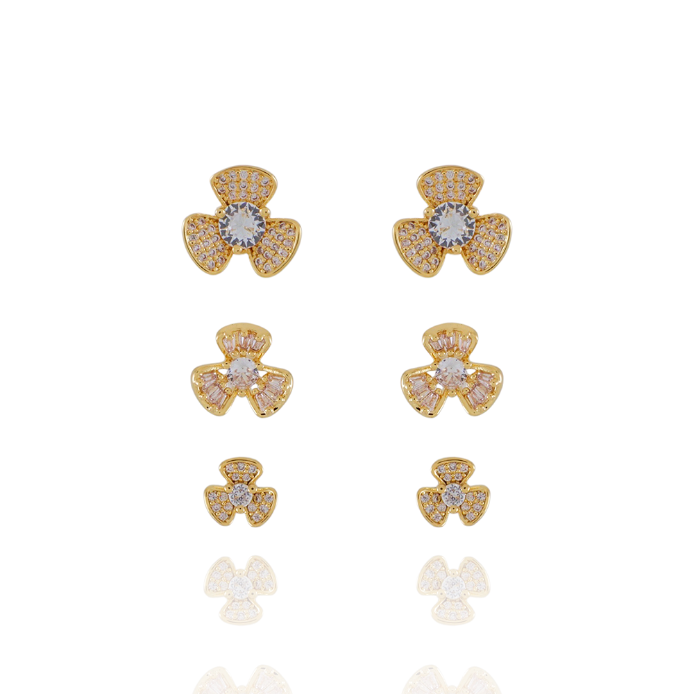 Encante-se com esse brinco!Este lindo brinco TRIO DE BRINCOS DE FLOR CRAVEJADOS DE ZIRCÔNIAS CRISTAIS é feito com LATÃO BANHADO A OURO 18K de alta qualidade.
