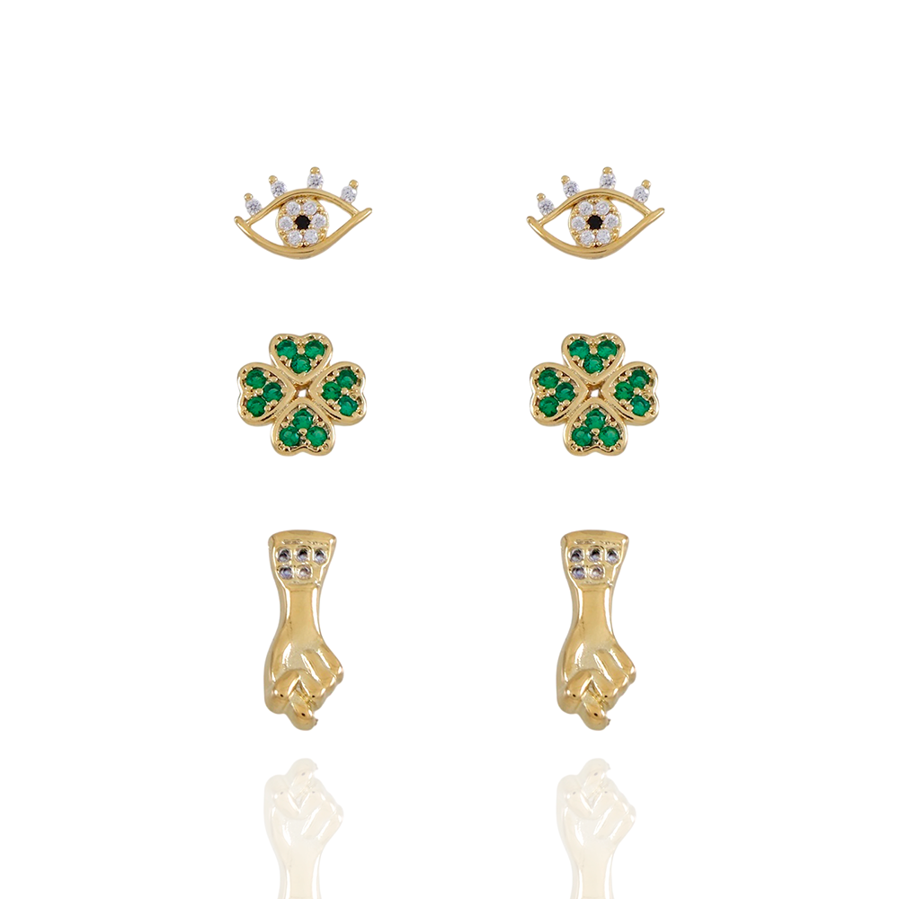 Trio-1180-Do Trio De Brincos Proteção Olho Grego, Trevo De Quatro Folhas E Figa.