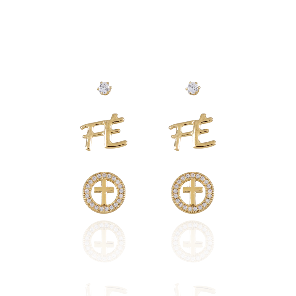 Trio-1198-Do Trio De Brinco Religioso Fé, Cruz E Zircônia Cristal.