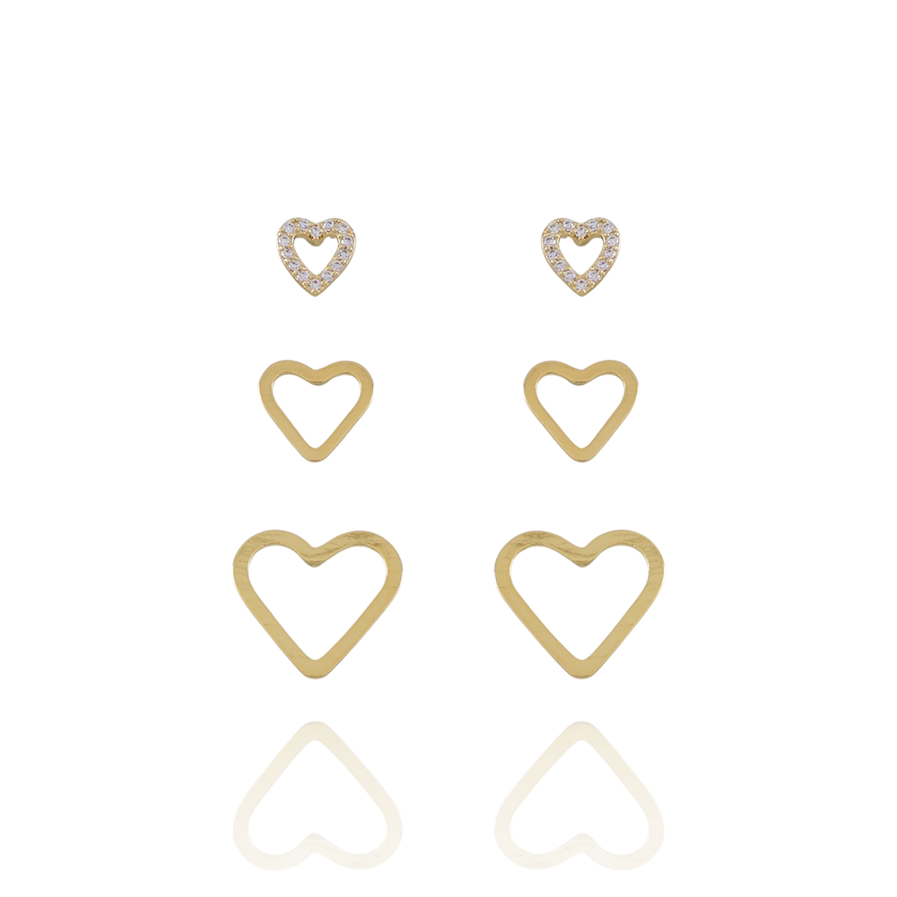 Encante-se com esse brinco!Este lindo brinco TRIO DE CORAÇÕES LISOS E CRAVEJADOS CRISTAL é feito com LATÃO BANHADO A OURO 18K de alta qualidade.