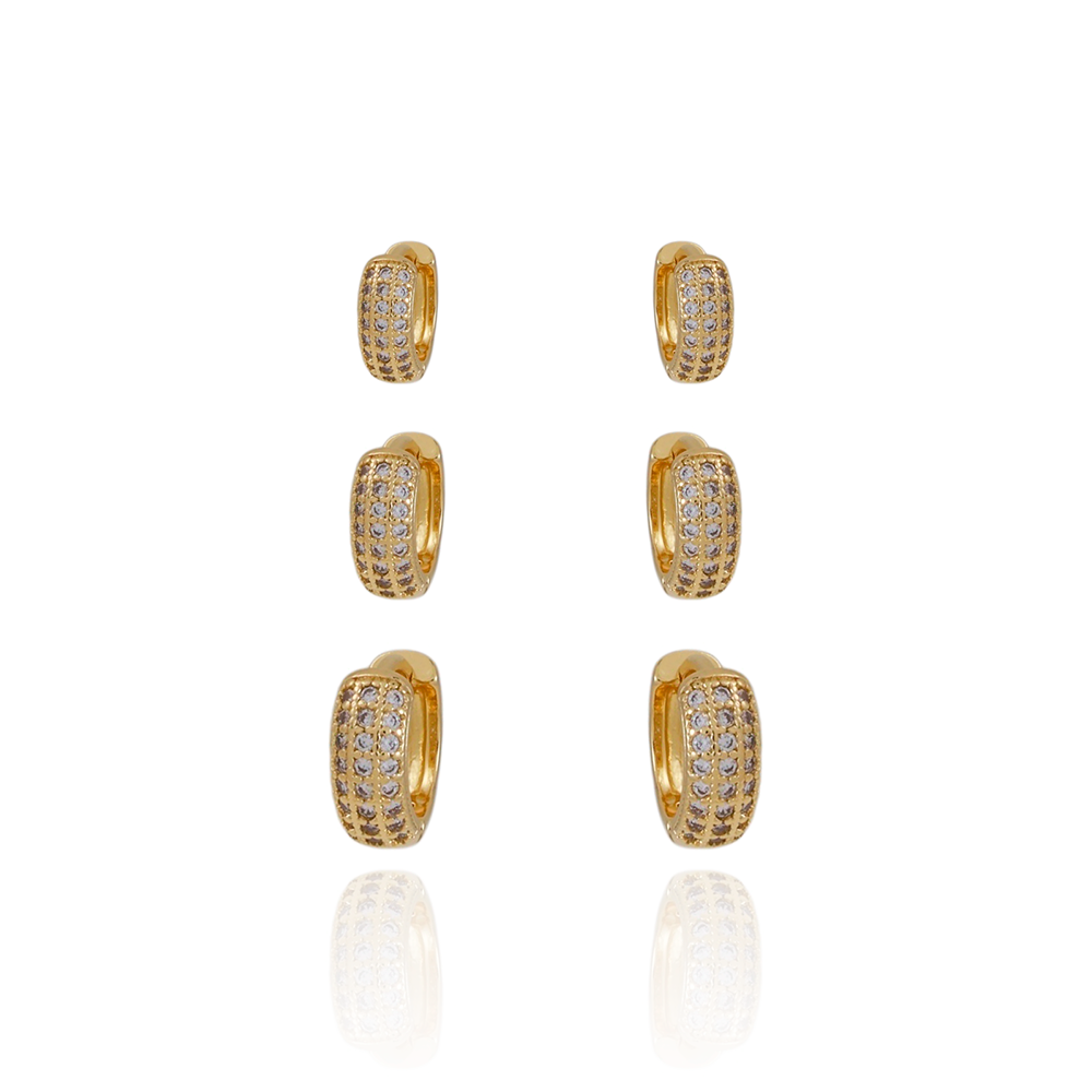 Este lindo brinco TRIO DE ARGOLAS ARTICULADAS CRAVEJADAS CRISTAL é feito com LATÃO BANHADO A OURO 18K de alta qualidade.