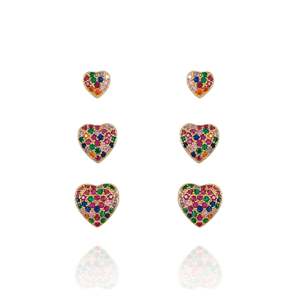 Trio-1221-Do Trio De Brincos De Corações Cravejados Coloridos (6mm/9mm/10mm).