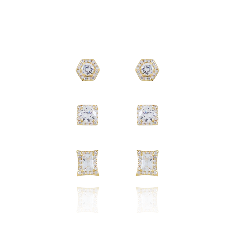 Encante-se com esse brinco!Este lindo brinco TRIO DE BRINCOS GEOMÉTRICOS CRAVEJADOS DE ZIRCÔNIAS CRISTAIS é feito com LATÃO BANHADO A OURO 18K de alta qualidade.