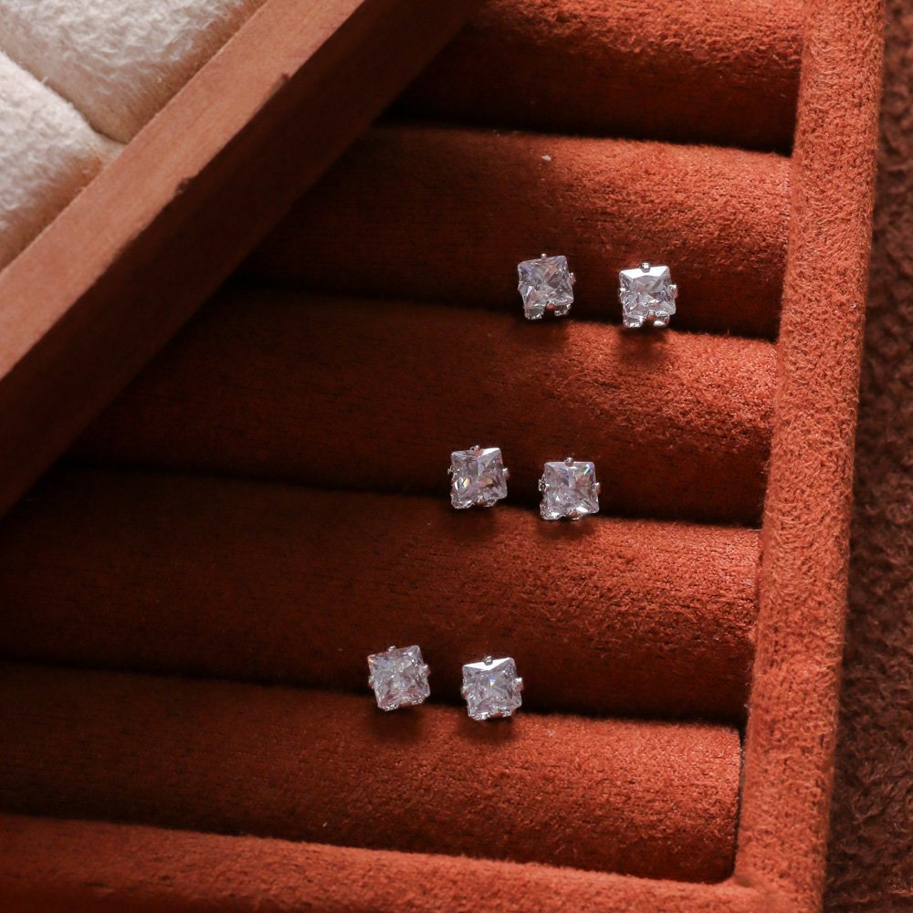 Trio-134-Rd Trio De Brincos Carrê Cristal - Ródio Branco (4mm).