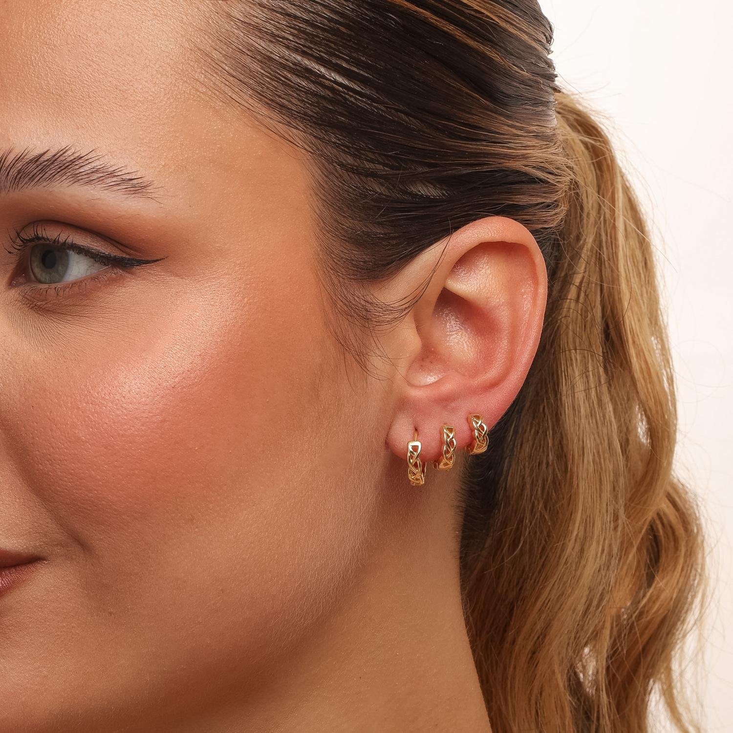 Eleve o nível das suas composições com este trio de argolas trabalhadas, que foge do óbvio e traz uma textura rica e sofisticada. Com um design ondulado e detalhes que lembram o entrelaçado clássico, estas peças adicionam volume e movimento ao visual, sendo ideais para quem busca um acessório que se destaque com elegância. O sistema de fechamento em click garante praticidade máxima e segurança para o uso contínuo, permitindo que você crie um degradê perfeito no primeiro, segundo e terceiro furo. Esta semijoia banhada a ouro 18k é a escolha ideal para transitar entre o ambiente de trabalho e eventos sociais, garantindo sempre um toque de modernidade e requinte à sua imagem.Detalhes do Produto