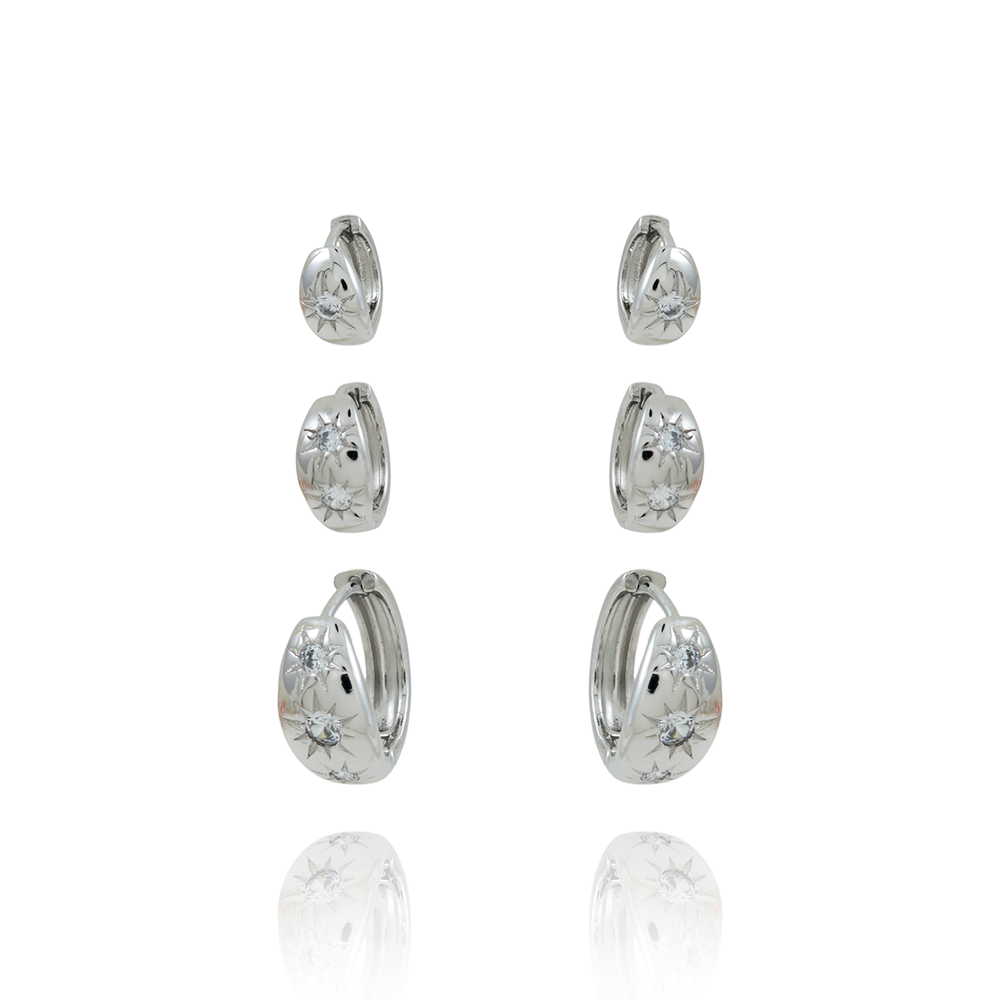 Trio-211-Rd Trio De Brincos De Argolas Articuladas Cravejadas Crisral - Ródio Branco.