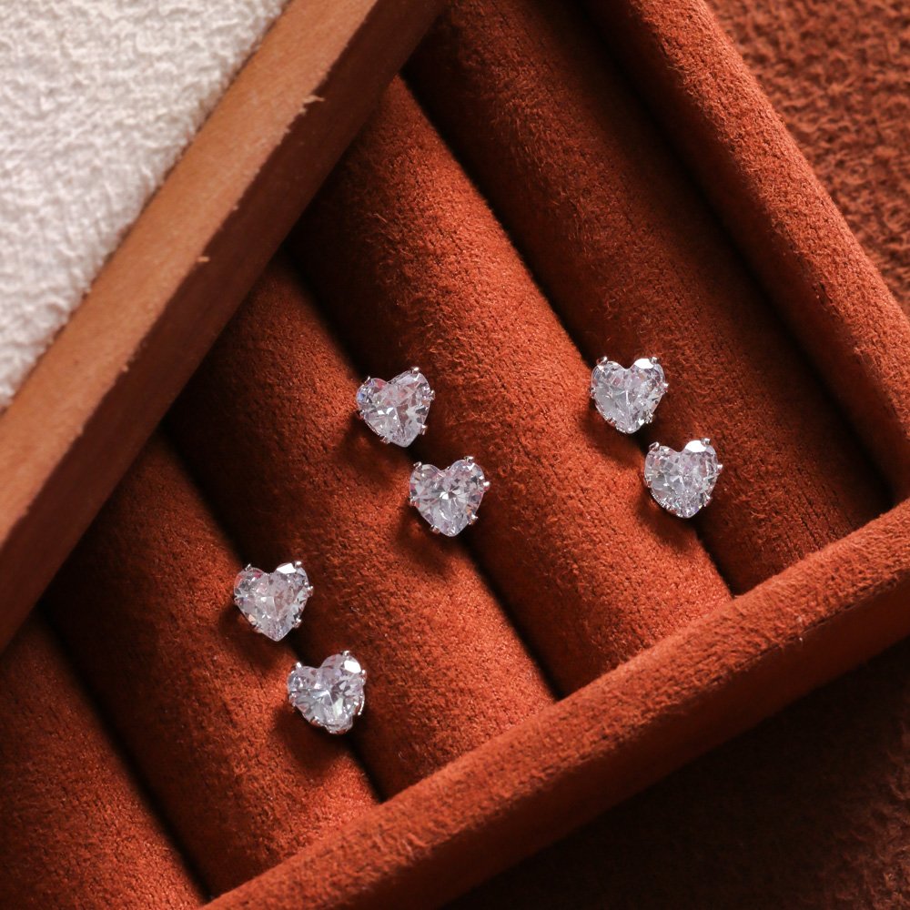 Trio-363-Rd Trio De Brincos De Corações Cristais - Ródio Branco (6mm).