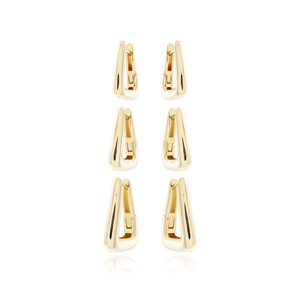 Encante-se com esse brinco!Este lindo brinco TRIO DE ARGOLAS ARTICULADA TRIANGULAR é feita com LATÃO BANHADO A OURO 18K de alta qualidade.